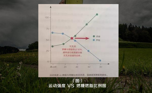 上面這張圖可以看得出來(lái),越是做強(qiáng)度越高的運(yùn)動(dòng)身體越是偏消耗血糖為主,因?yàn)檫@種供能方式很迅速,而越是強(qiáng)度低的運(yùn)動(dòng)脂肪消耗的比例就越大。這個(gè)血糖消耗和脂肪消耗曲線有一個(gè)交點(diǎn),在這一點(diǎn)上也就是說(shuō)脂肪和血糖消耗的比例是 50:50。在現(xiàn)實(shí)有沒(méi)有辦法把這個(gè)點(diǎn)往右邊移動(dòng),那么以后你所做運(yùn)動(dòng)的強(qiáng)度只要保持在這個(gè)點(diǎn)左邊那么就是以消耗脂肪為主。