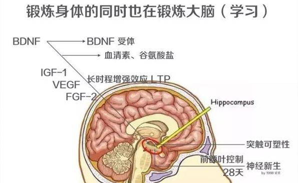 同時(shí)過(guò)往生物老師都告訴我們神經(jīng)不能再生,事實(shí)上在 1998 年科學(xué)家已經(jīng)發(fā)布論文,發(fā)現(xiàn)神經(jīng)是可以再生的,通過(guò)運(yùn)動(dòng)產(chǎn)生 BDNF(腦源性神經(jīng)營(yíng)養(yǎng)因子)最終不僅促進(jìn)海馬區(qū)的突觸可塑性,加強(qiáng)記憶;同時(shí)可以促進(jìn)促進(jìn)神經(jīng)新生,再由前額葉控制在 28 天后經(jīng)過(guò)分化成為新的神經(jīng)細(xì)胞。