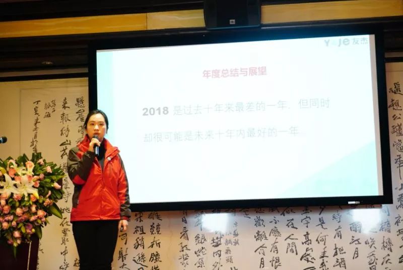 接下來,重慶友杰的銷售總監(jiān)楊潔女士做了年度報告和新年展望,她指出2018是最差的一年,同時也是最好的一年。大家要做好面對更加多變復(fù)雜市場環(huán)境的準備,同時更要提升自己,堅定信心,在競爭激烈的紅海里面開拓出屬于自己的藍海。