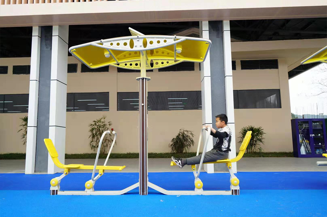 器材以深棕色塑木邊條做裝飾,采用灰色與黃色色調(diào)相搭配。讓器材既能與自然環(huán)境相融合,又不失運(yùn)動的活力氣息。