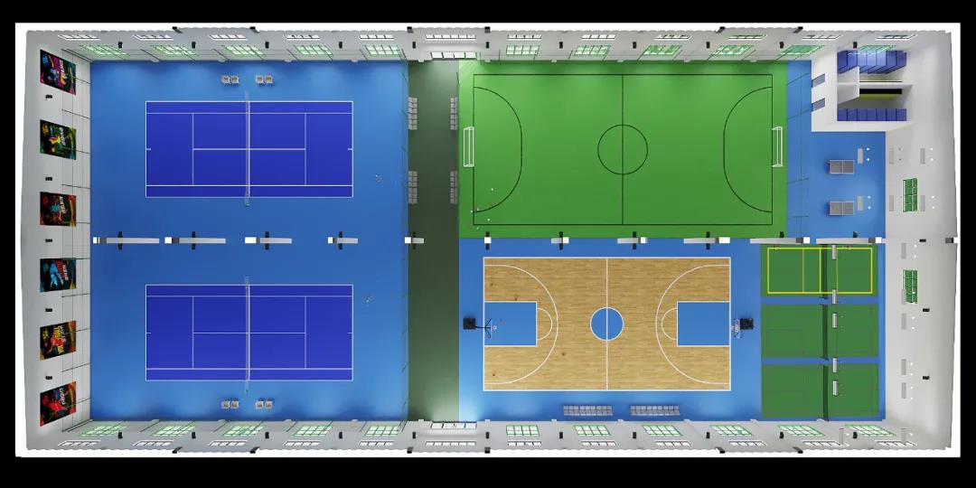 整個場館包含了網(wǎng)球場,五人制足球場,籃球場,乒乓訓(xùn)練場,羽毛球場