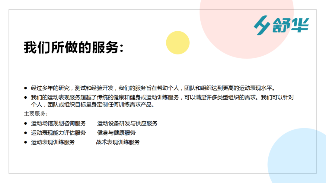隨著社會(huì)對(duì)體能訓(xùn)練需求的日益增加,舒華成立了體能專業(yè)團(tuán)隊(duì),團(tuán)隊(duì)成員來自世界各地,他們由國際認(rèn)證體能教練、運(yùn)動(dòng)表現(xiàn)專家、物理治療師、注冊(cè)營(yíng)養(yǎng)師、體育心理學(xué)家組成,擁有深厚的專業(yè)知識(shí)及豐富經(jīng)驗(yàn)??梢葬槍?duì)個(gè)人,團(tuán)隊(duì)或組織目標(biāo)量身定制任何訓(xùn)練需求產(chǎn)品。主要服務(wù):運(yùn)動(dòng)場(chǎng)館規(guī)劃咨詢服務(wù),運(yùn)動(dòng)設(shè)備研發(fā)與供應(yīng)服務(wù),運(yùn)動(dòng)表現(xiàn)能力評(píng)估服務(wù), 健身與健康服務(wù),運(yùn)動(dòng)表現(xiàn)訓(xùn)練服務(wù),戰(zhàn)術(shù)表現(xiàn)訓(xùn)練服務(wù)等。