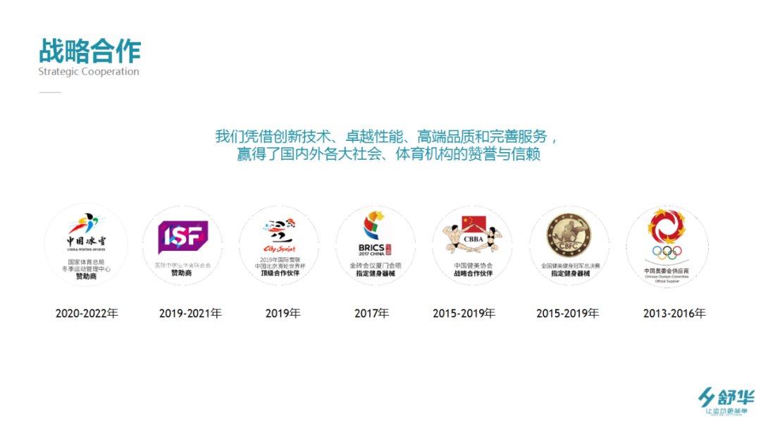 2019年,舒華與國家體育總局冬季運(yùn)動(dòng)管理中心合作,成為國際雪聯(lián)中國北京滑輪世界杯頂級(jí)合作伙伴,入駐國家體育總局冬運(yùn)中心“泰皇島”及“首鋼園”訓(xùn)練基地體能館并成為體能大比武活動(dòng)贊助商。云南騰沖啟迪雙創(chuàng)冰雪小鎮(zhèn),西南最大室內(nèi)冰雪館,也有舒華室內(nèi)體能館。