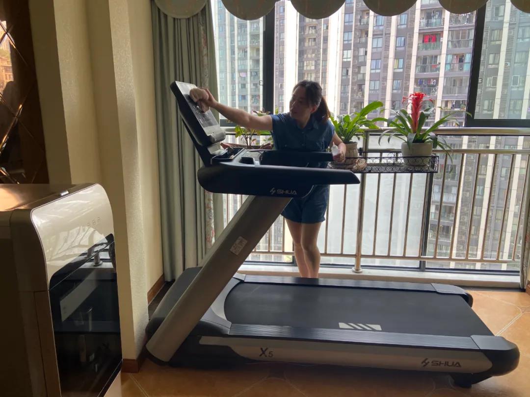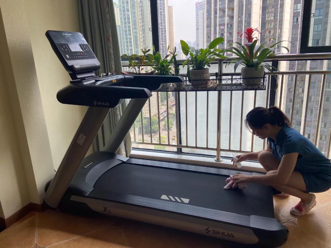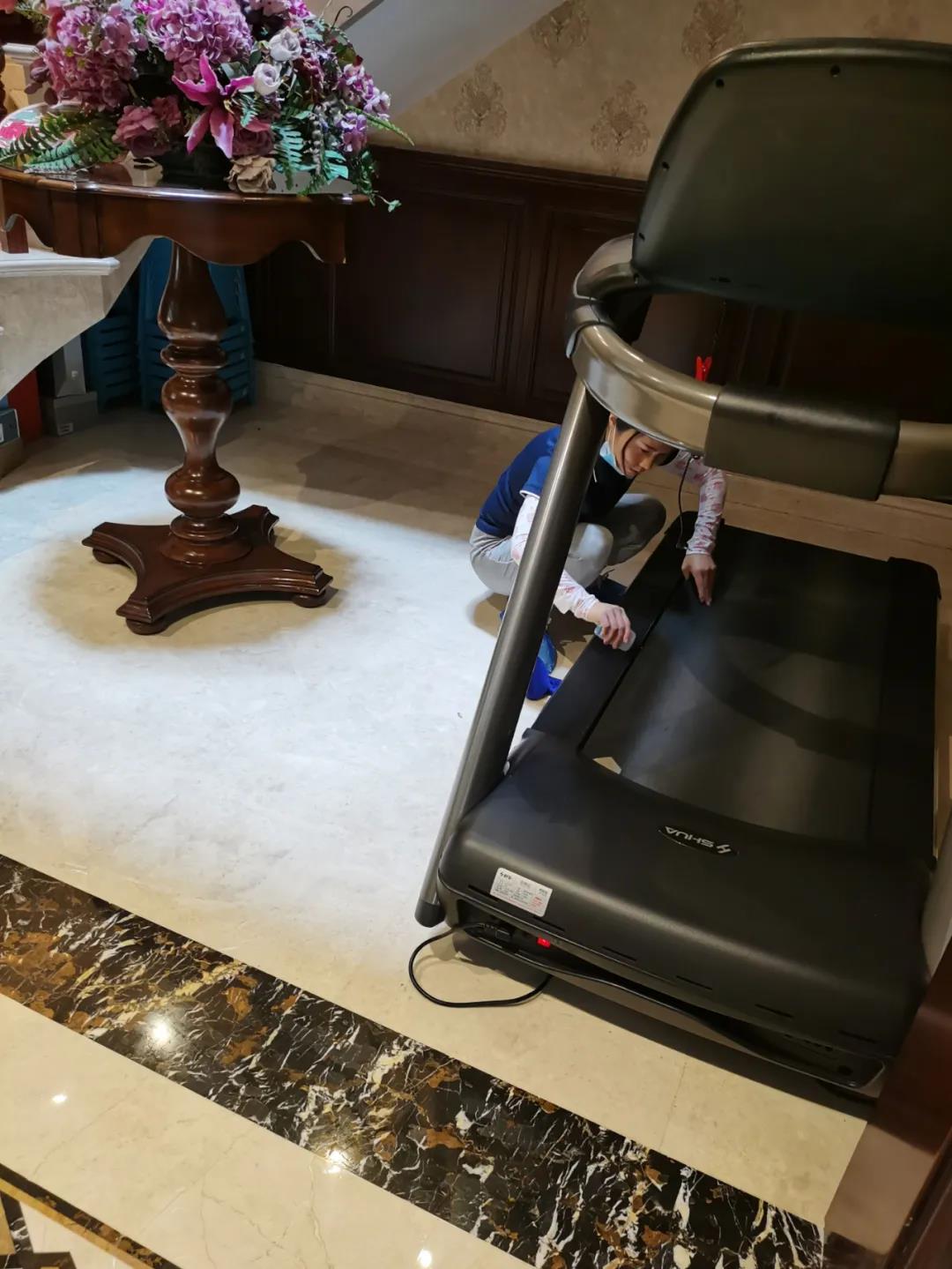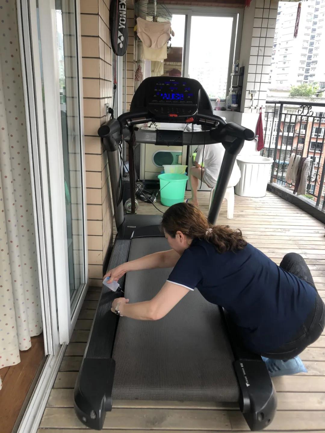 現(xiàn)場(chǎng)清理跑步機(jī)表面的灰塵、毛絮
