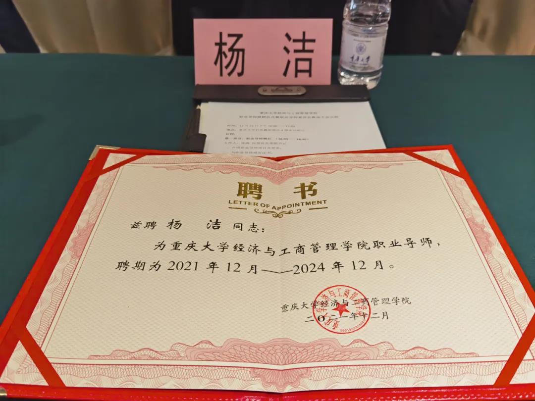 重慶友杰體育產(chǎn)業(yè)發(fā)展有限公司總經(jīng)理?xiàng)顫嵟渴苎麉⒓哟舜问?huì),并榮耀受聘擔(dān)任重慶大學(xué)經(jīng)濟(jì)與管理學(xué)院職業(yè)導(dǎo)師,經(jīng)管院黨委書記嚴(yán)太華為重慶友杰楊潔女士頒發(fā)榮譽(yù)聘書。