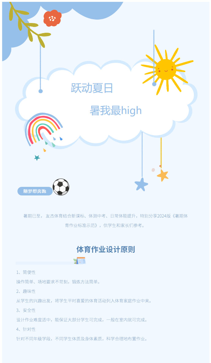 暑期已至,友杰體育結(jié)合新課標(biāo)、體中考、日常體能提升,特別分享2024版《暑期體育作業(yè)標(biāo)準(zhǔn)示范》,供學(xué)生和家長們參考。